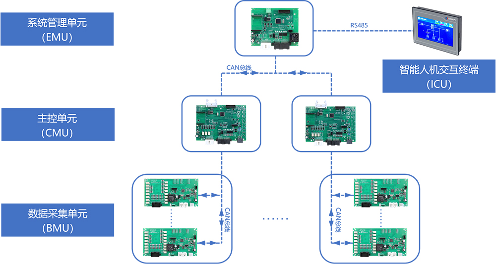 電池管理系統(tǒng)由數(shù)據采集單元BMU、主控單元 CMU、系統(tǒng)管理單元 EMU、智能人機交互終端 ICU 組成,融合高精度核心算法、主動均衡/被動均衡、主動安全策略等先進技術,實現(xiàn)電池單體級到系統(tǒng)級多層級的智能管控。